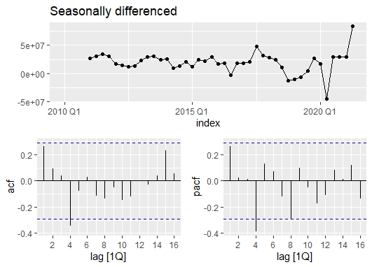To the plot above, the mean seems to be stabilized; we don’t need to take a further difference. In order to find appropriate the ARIMA model, we first would look at the ACF graph. There is a spike at lag 4 which leads to a seasonal MA(1) component. On the other hand, based on PACF, there is a significant spike at lag 4 which also leads to a seasonal AR(1) component.