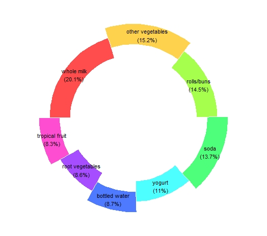 The whole milk appears to be the most frequent item in all transactions. Let’s see if this superiority is reflected in the association rules.