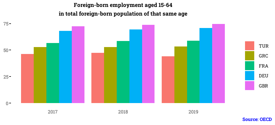 It seems that among the immigrant population less than half have had a job in Turkey, which is a low rate compared to the other countries.