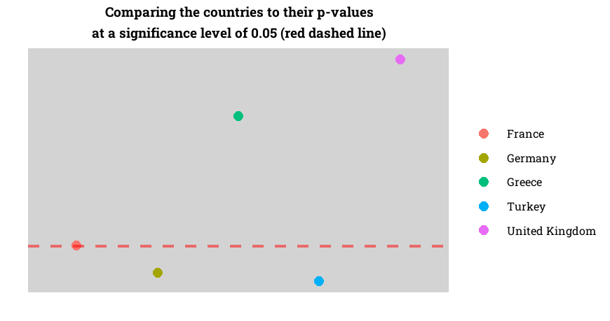labs(title ="Comparing the countries to their p-values\nat a significance level of 0.05 (red dashed line)" ,