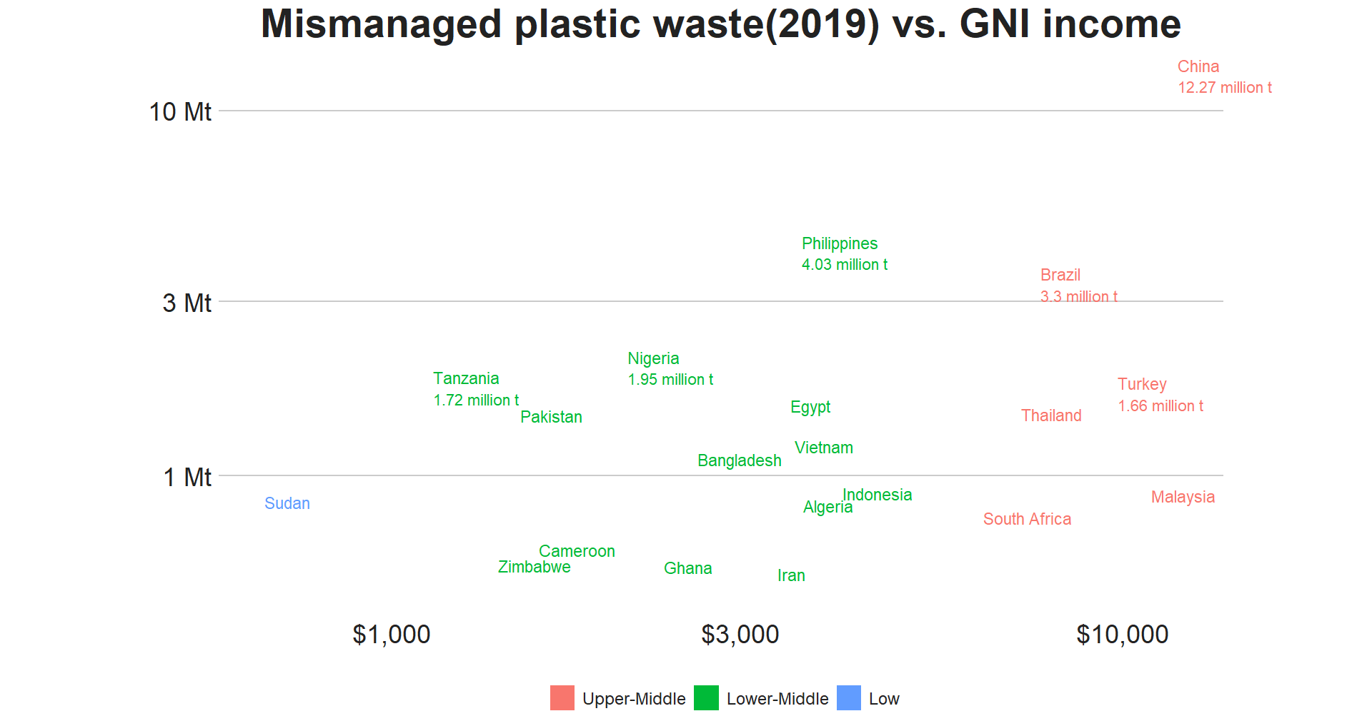 labs(title= "Mismanaged plastic waste(2019) vs. GNI income")+