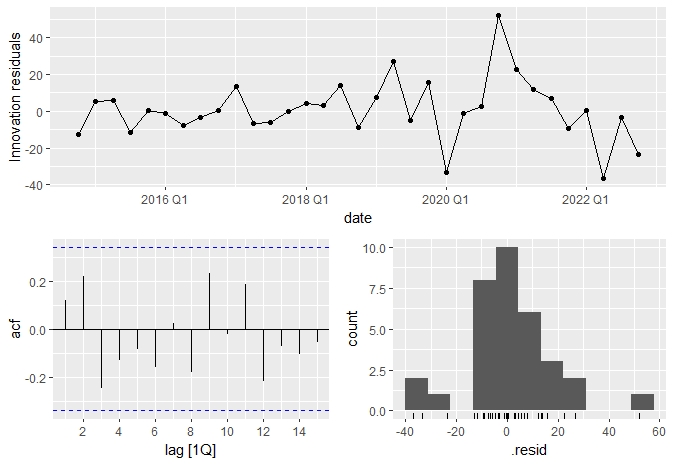 Because the p-value is higher than 0.05, we would reject the alternative hypothesis, which means there is a correlation in residuals. Hence, our model is valid. As the residuals are similar to those normally distributed, we don’t have to obtain a bootstrapped version of the prediction intervals.