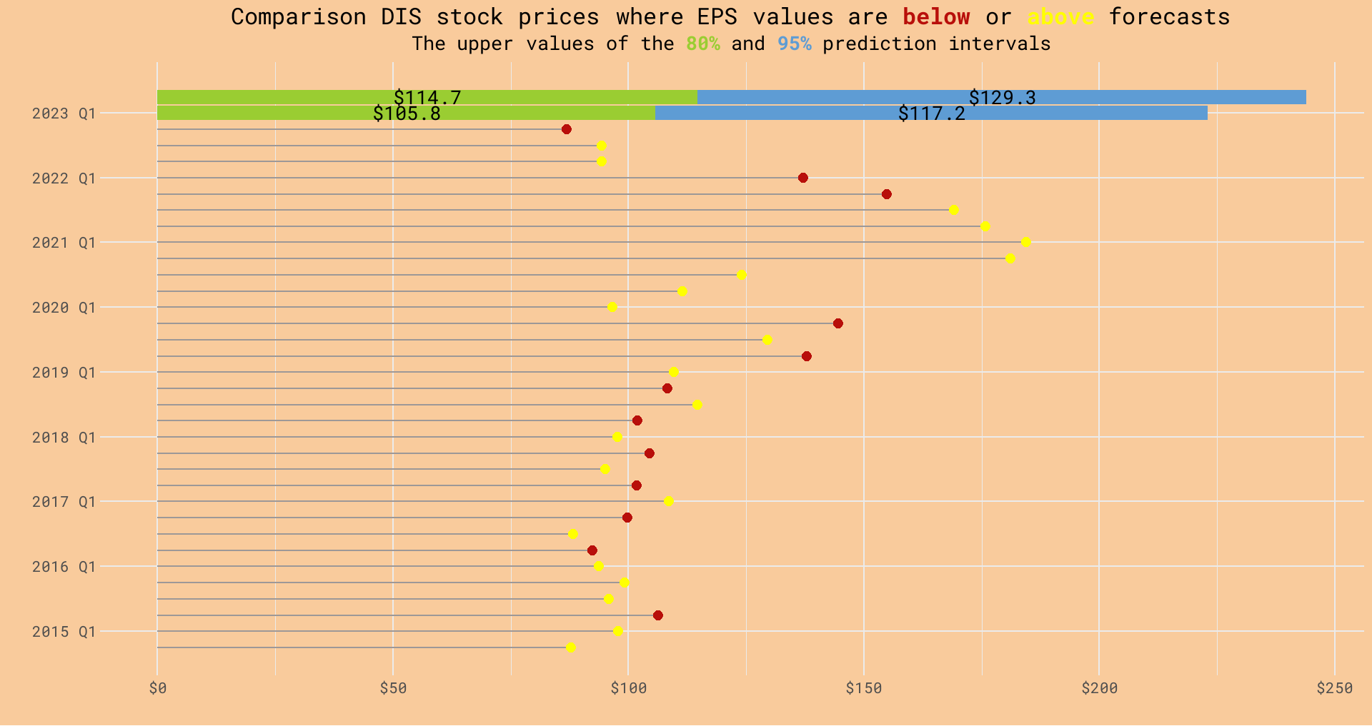 title = "Comparison DIS stock prices where EPS values are <span style = 'color:#b80f0a'><b>below</b></span> or <span style = 'color:#ffff00'><b>above</b></span> forecasts",