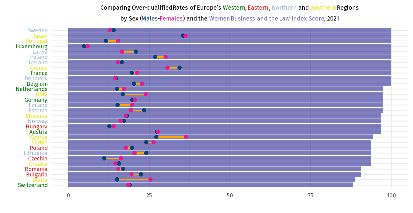 Over-qualification employment is when people with higher education are employed in jobs that do not require such a high level of education. We will compare over-qualification rates by gender and the women business and the law index. This index measures how laws and regulations affect the opportunities women have in their workforce ecosystems.