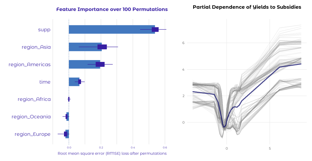 We created a partial dependence graph for the feature importance graph’s most effective variable (supp), which is shown on the right-hand graph. In most cases, there’s a positive linear relationship between subsidies and crop yields on the positive side of the graph. However, it tends to flatten out towards the end. So maybe we can conclude that the effect of subsidies is fading in terms of agricultural yields. Don’t forget that the values are normalized for the modeling.