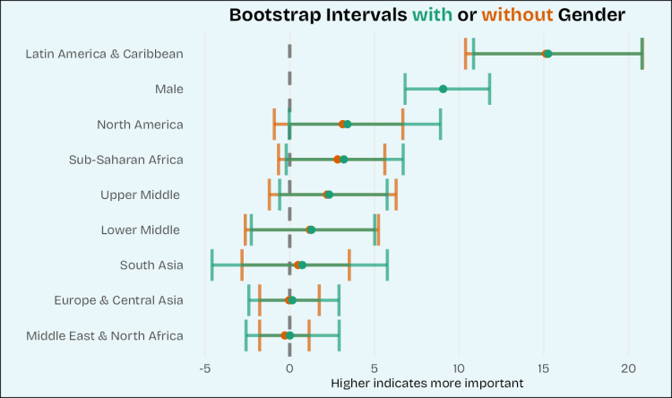 Passing the vertical dashed line (zero point) in the related intervals indicates significantly not the importance of the related variables, which confirms the spider chart above for the Male and Latin America & Caribbean variables.