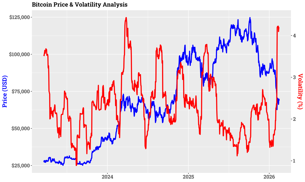 Chart Analysis: Bitcoin Price vs. Volatility (2023–2026)